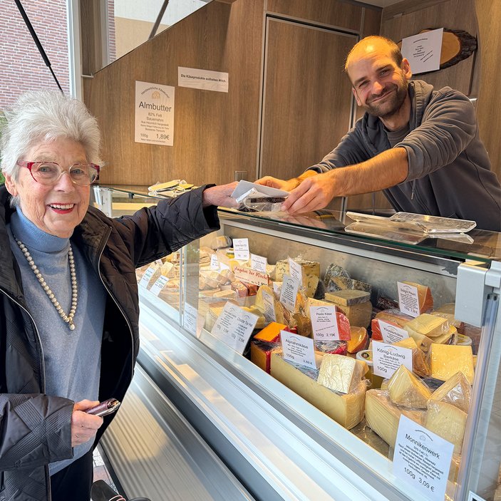 Mittwochs ist in der Senioren-Residenz Hasselbachtal neuerdings "Käse-Tag". Zwischen 13.30 und 14 Uhr rollt der Käsewagen von Anne und René Albers vor die Eingangstür im Walter-Flex-Weg 4. Dann warten bereits ein paar Seniorinnen und Senioren mit Einkaufstasche und Portemonnaie im Foyer der Residenz und laufen voller Vorfreude nach draußen, den freundlichen Käse-Händlern entgegen. Christel Goldhorn gehört meist zu den ersten Kundinnen. Sie liebt guten Käse und freut sich über diese besondere Auswahl an Käsesorten aus dem Allgäu, aus Holland und von regionalen Höfen, darunter auch ein paar Raritäten und Spezialitäten. Und das alles gibt es jetzt direkt vor ihrer Haustür.
